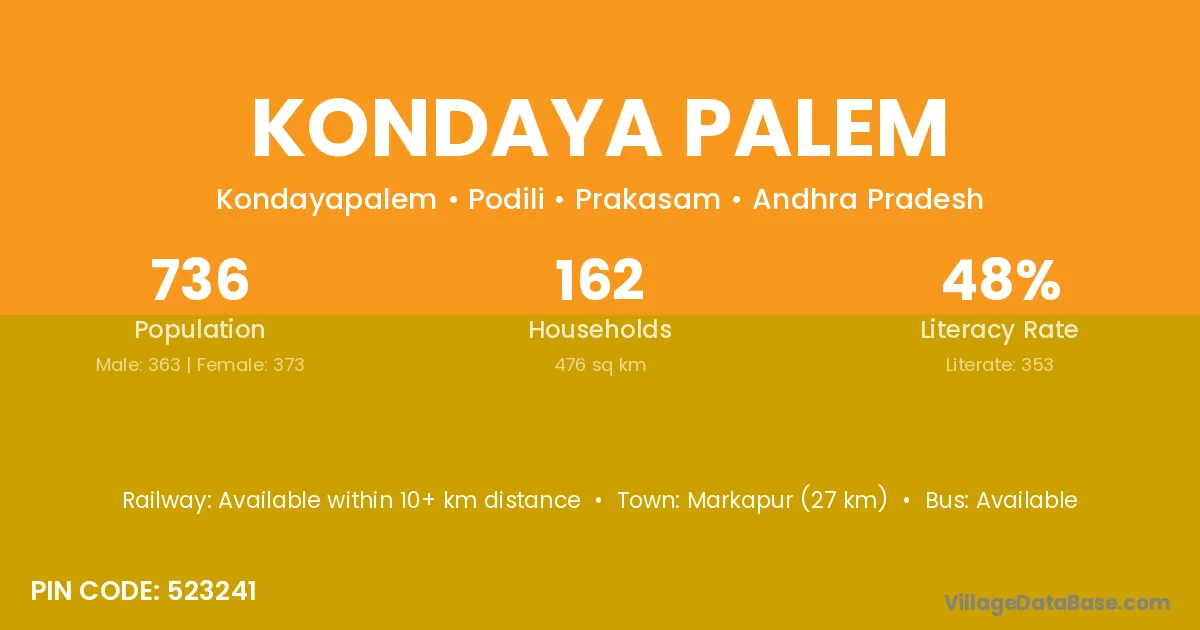Markapur (27 km) is the nearest town to Kondaya Palem village for major economic activities and is located approximately 27 km away.