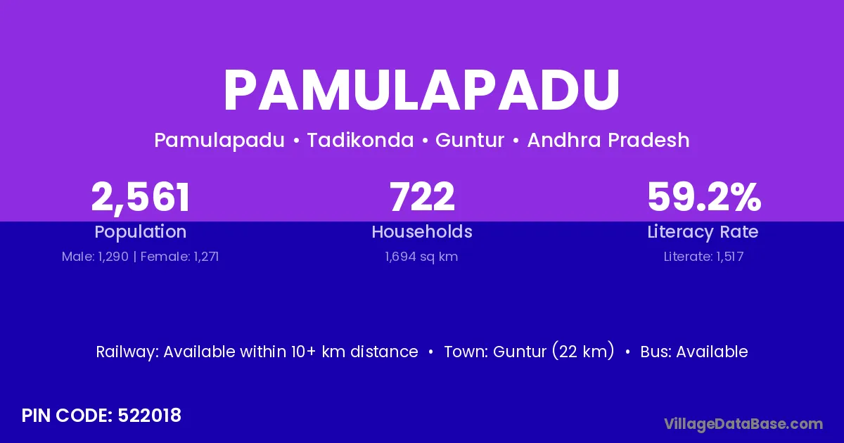 Markapur (55 km) is the nearest town to Pamulapadu village for major economic activities and is located approximately 55 km away.