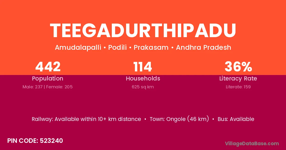 Teegadurthipadu village has a total population of 442 people, of which 237 are males and 205 are females.