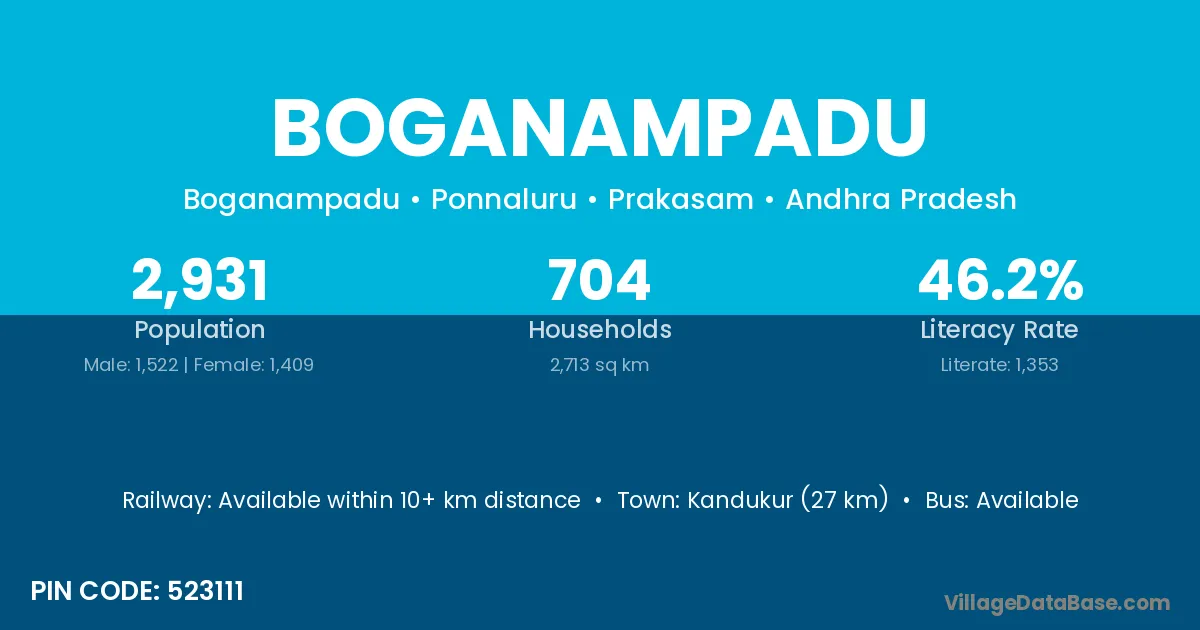 Kandukur (27 km) is the nearest town to Boganampadu village for major economic activities and is located approximately 27 km away.