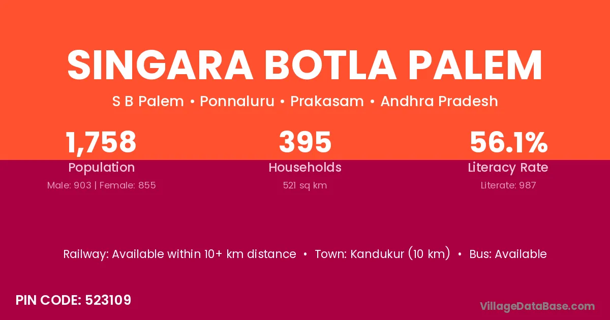 Singara Botla Palem village has a total population of 1,758 people, of which 903 are males and 855 are females.