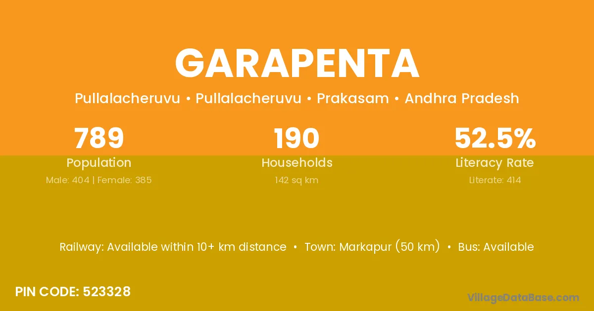 Markapur (50 km) is the nearest town to Garapenta village for major economic activities and is located approximately 50 km away.