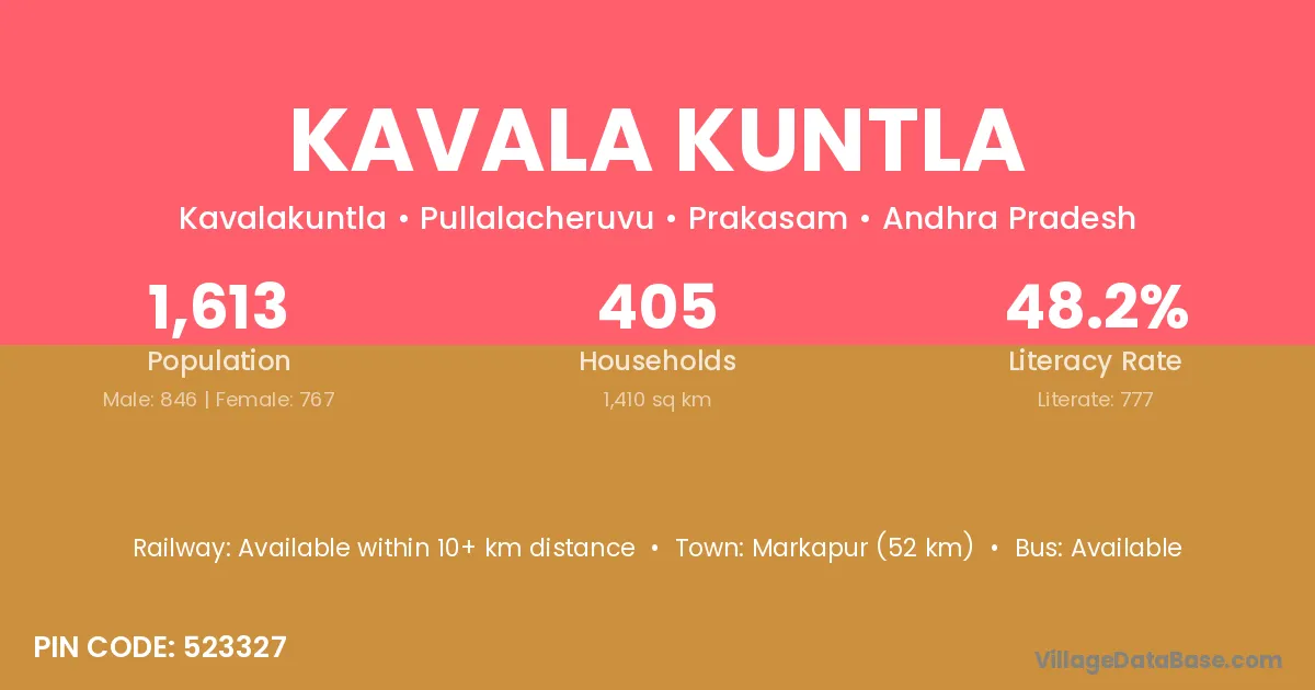 Markapur (52 km) is the nearest town to Kavala Kuntla village for major economic activities and is located approximately 52 km away.