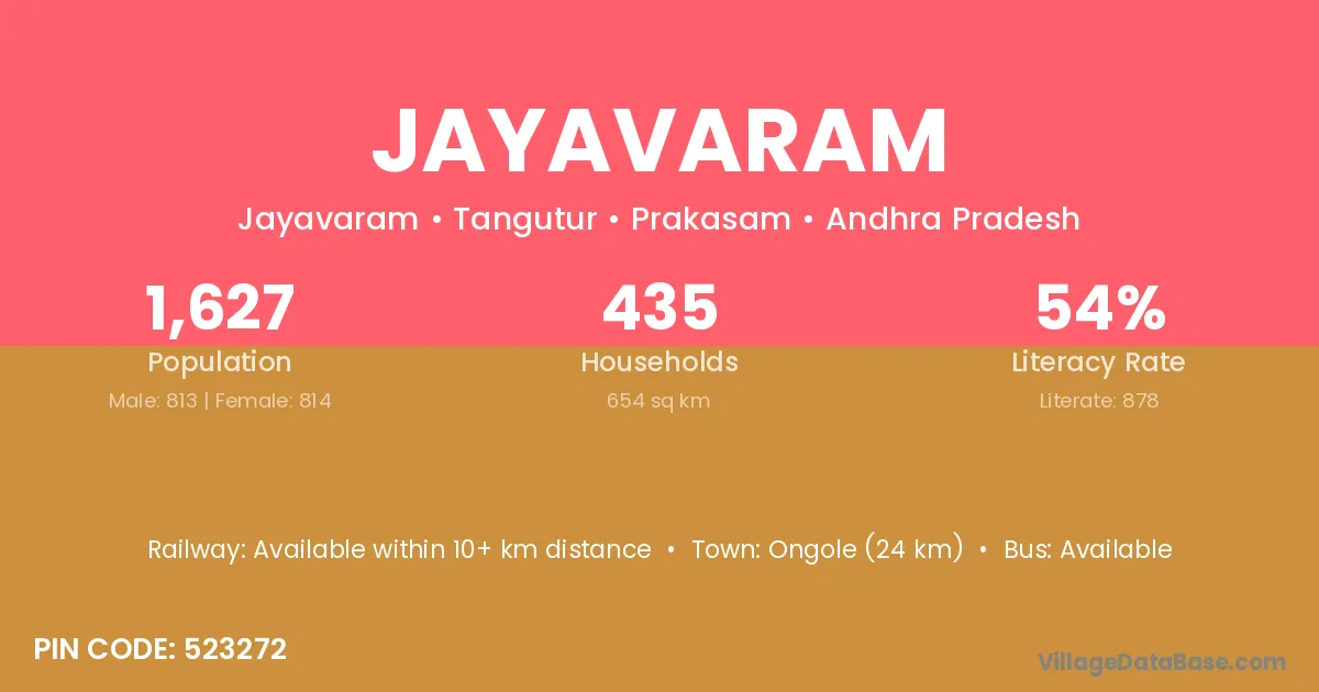 Ongole (24 km) is the nearest town to Jayavaram village for major economic activities and is located approximately 24 km away.