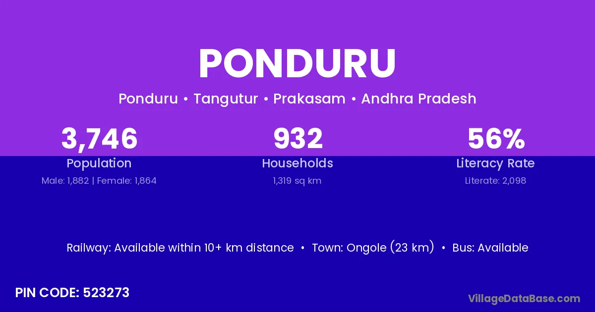 Ongole (23 km) is the nearest town to Ponduru village for major economic activities and is located approximately 23 km away.