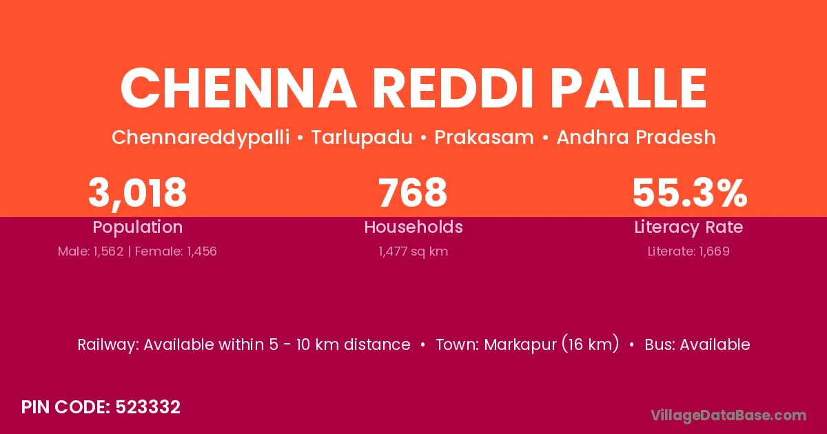 Markapur (16 km) is the nearest town to Chenna Reddi Palle village for major economic activities and is located approximately 16 km away.