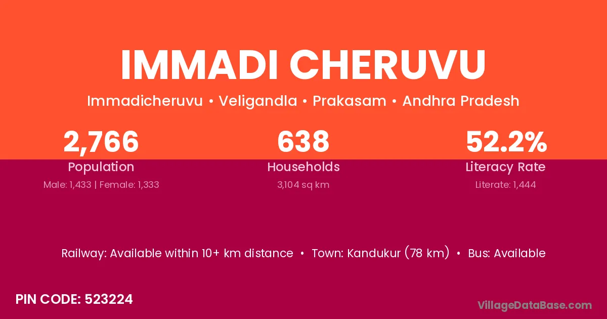 Kandukur (78 km) is the nearest town to Immadi Cheruvu village for major economic activities and is located approximately 78 km away.
