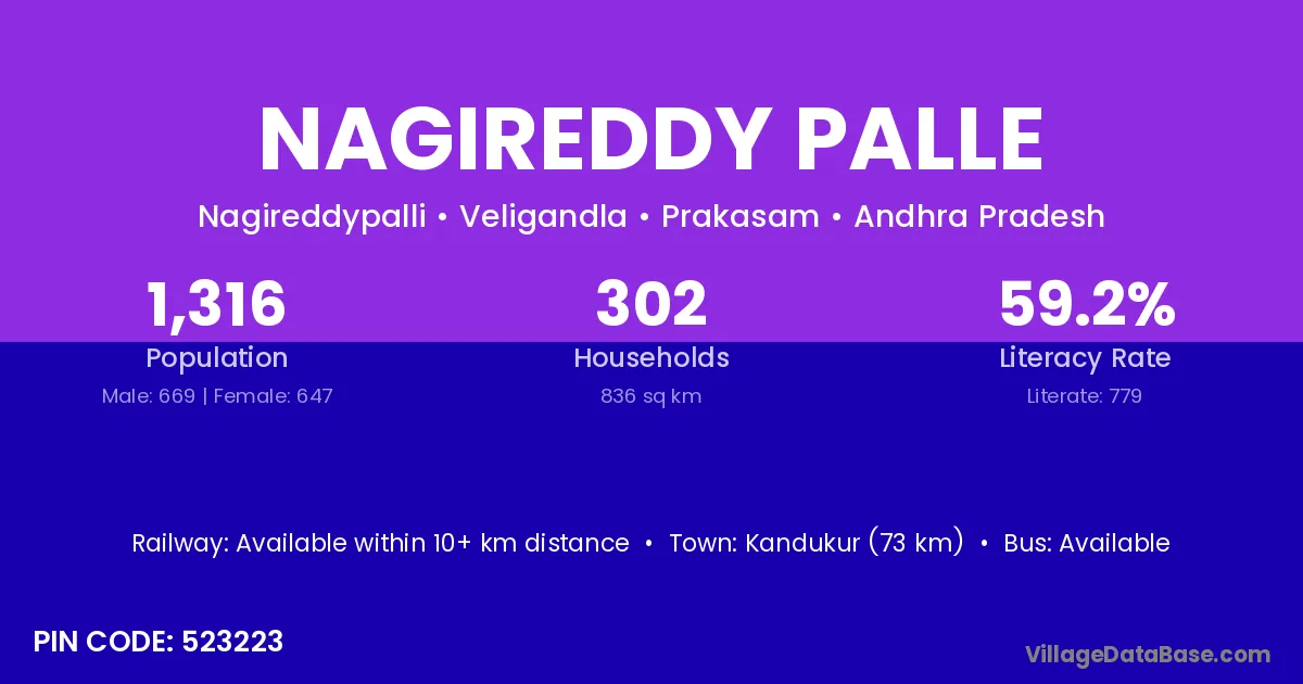 Kandukur (73 km) is the nearest town to Nagireddy Palle village for major economic activities and is located approximately 73 km away.