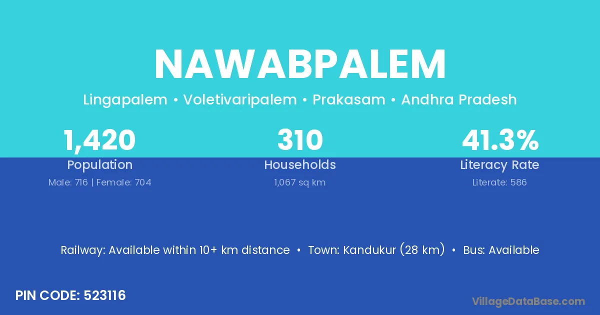 Nawabpalem village has a total population of 1,420 people, of which 716 are males and 704 are females.