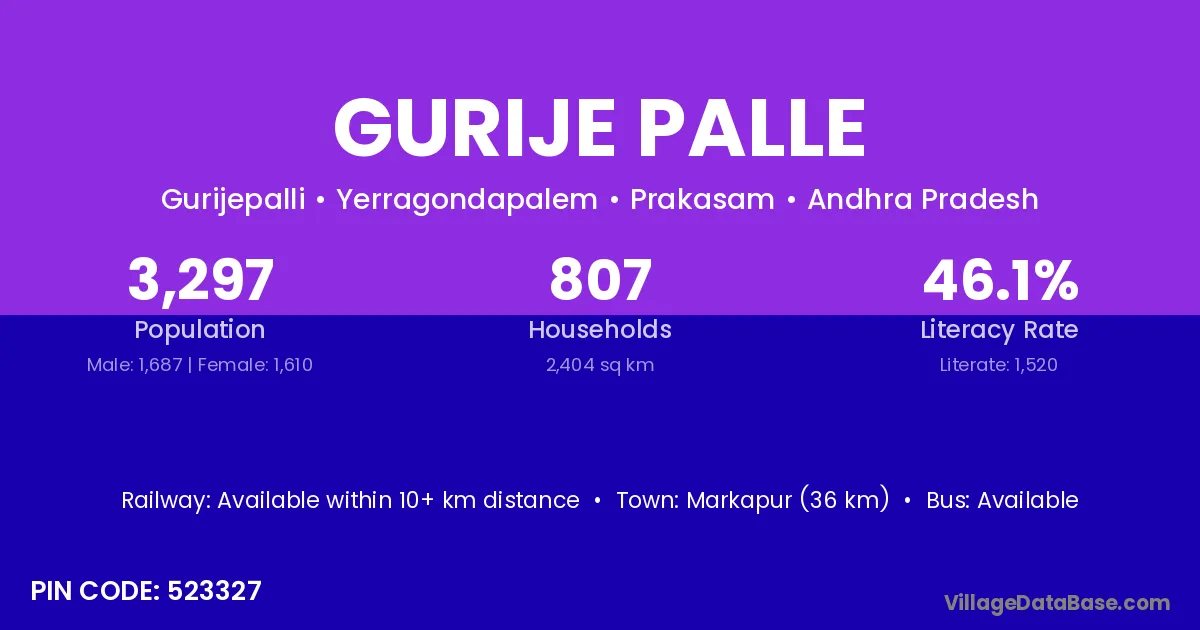 Markapur (36 km) is the nearest town to Gurije Palle village for major economic activities and is located approximately 36 km away.