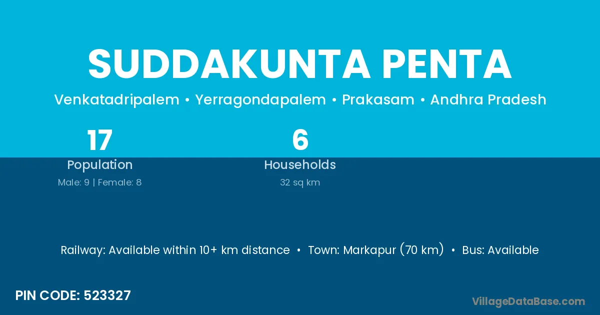 Markapur (70 km) is the nearest town to Suddakunta Penta village for major economic activities and is located approximately 70 km away.