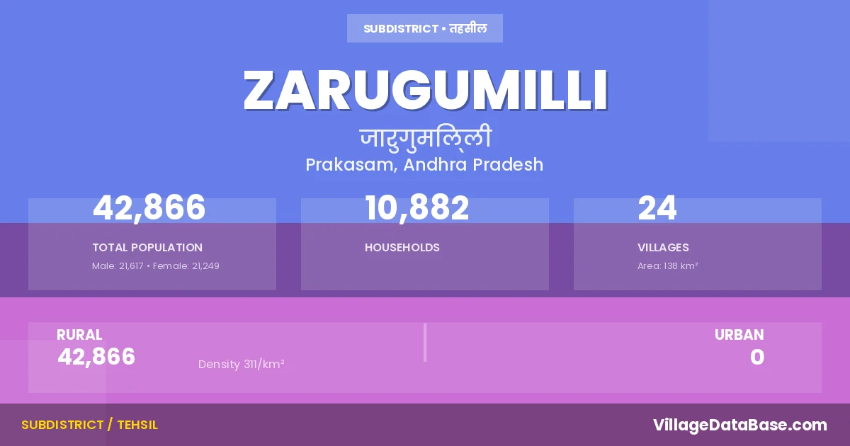 According to the 2011 census The total area of Zarugumilli Mandal is 138 km², with a population of 42866 people. The population density is 311 inhabitants per square kilometre, and there are approximately 10882 houses in the sub district.