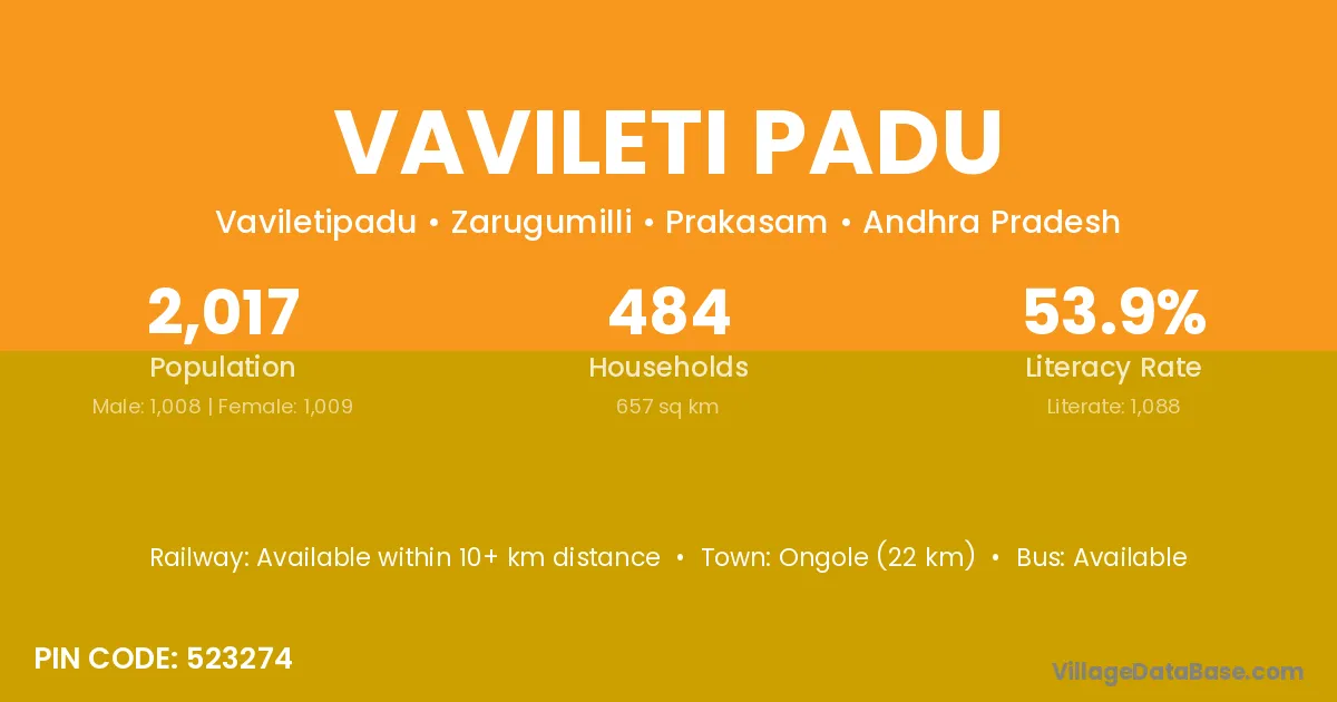 Ongole (22 km) is the nearest town to Vavileti Padu village for major economic activities and is located approximately 22 km away.