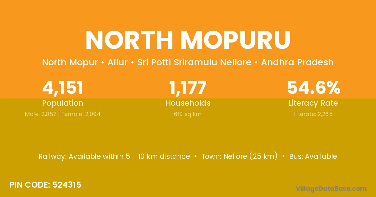 Nellore (25 km) is the nearest town to North Mopuru village for major economic activities and is located approximately 25 km away.