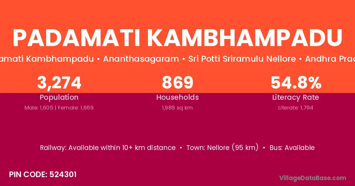 Nellore (95 km) is the nearest town to Padamati Kambhampadu village for major economic activities and is located approximately 95 km away.