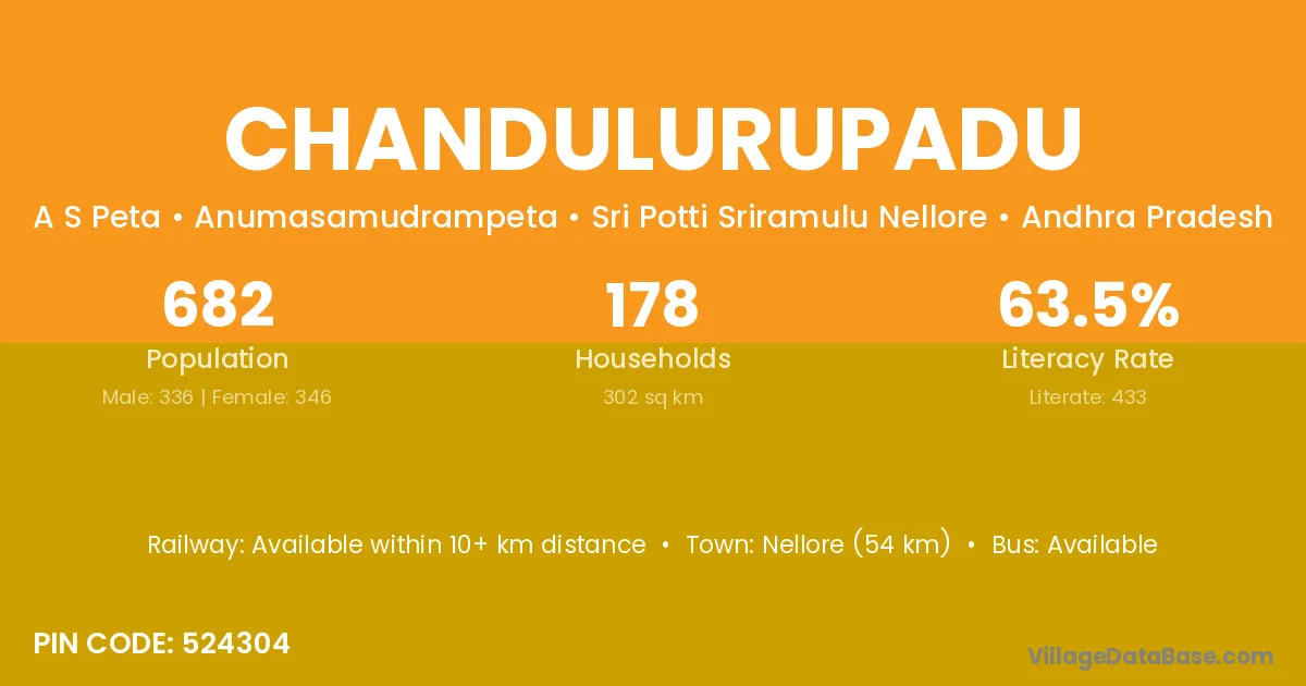 Nellore (54 km) is the nearest town to Chandulurupadu village for major economic activities and is located approximately 54 km away.