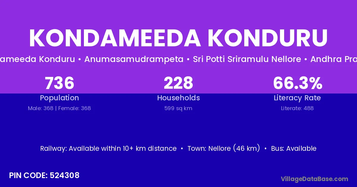 Nellore (46 km) is the nearest town to Kondameeda Konduru village for major economic activities and is located approximately 46 km away.