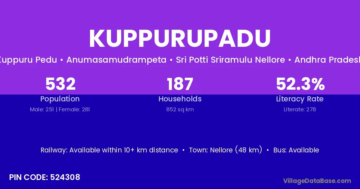 Kuppurupadu village has a total population of 532 people, of which 251 are males and 281 are females.