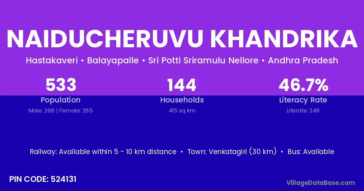 Naiducheruvu Khandrika village has a total population of 533 people, of which 268 are males and 265 are females.