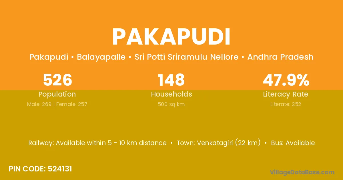 Pakapudi village has a total population of 526 people, of which 269 are males and 257 are females.