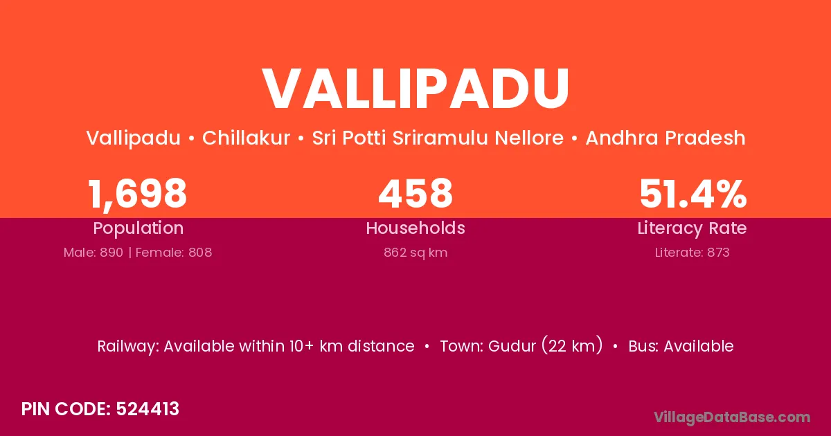 Vallipadu village has a total population of 1,698 people, of which 890 are males and 808 are females.