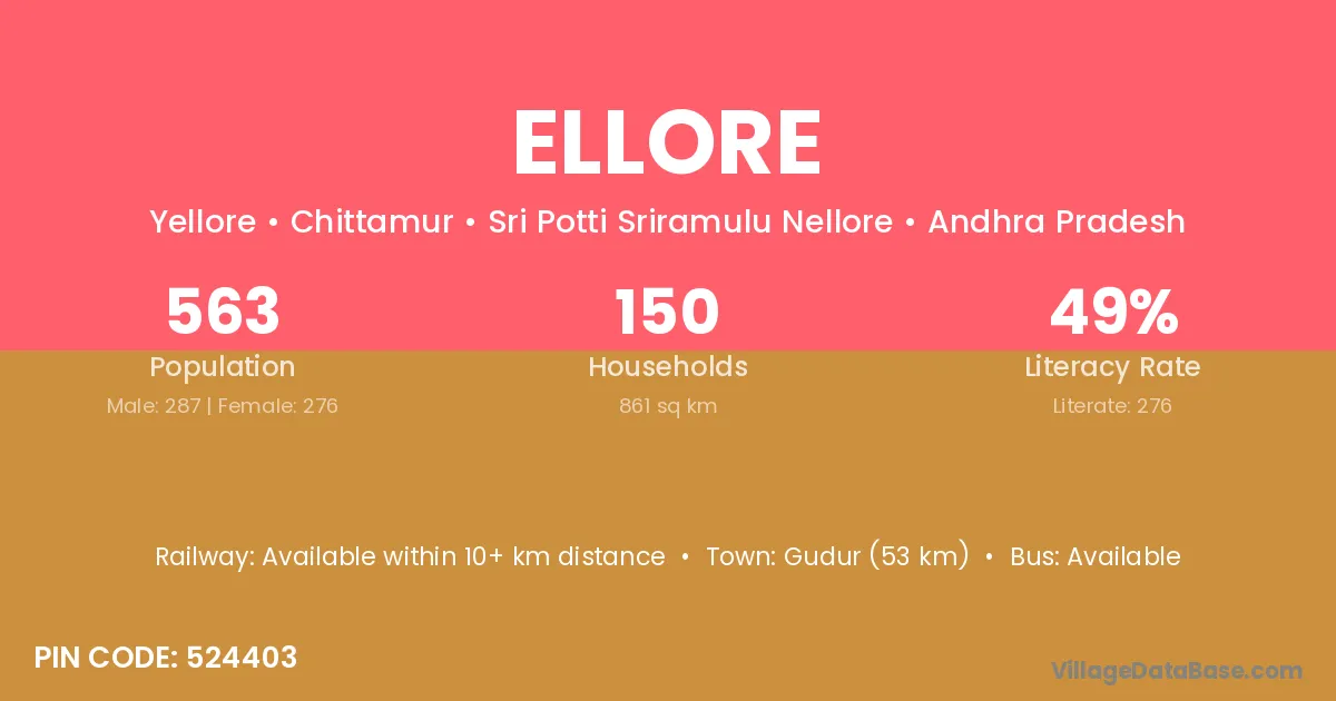 Gudur (53 km) is the nearest town to Ellore village for major economic activities and is located approximately 53 km away.