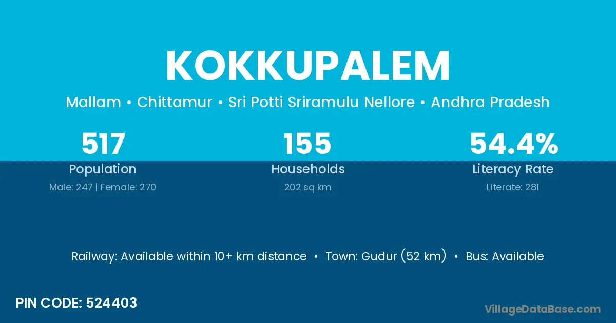 Gudur (52 km) is the nearest town to Kokkupalem village for major economic activities and is located approximately 52 km away.