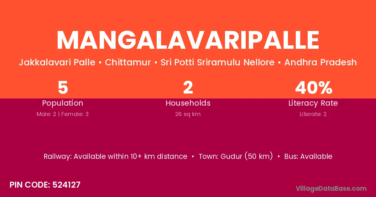 Mangalavaripalle village has a total population of 5 people, of which 2 are males and 3 are females.