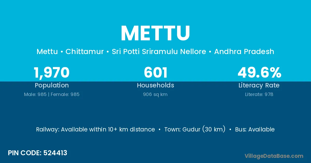 Gudur (30 km) is the nearest town to Mettu village for major economic activities and is located approximately 30 km away.