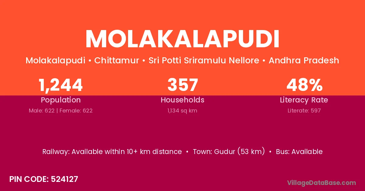 Molakalapudi village has a total population of 1,244 people, of which 622 are males and 622 are females.