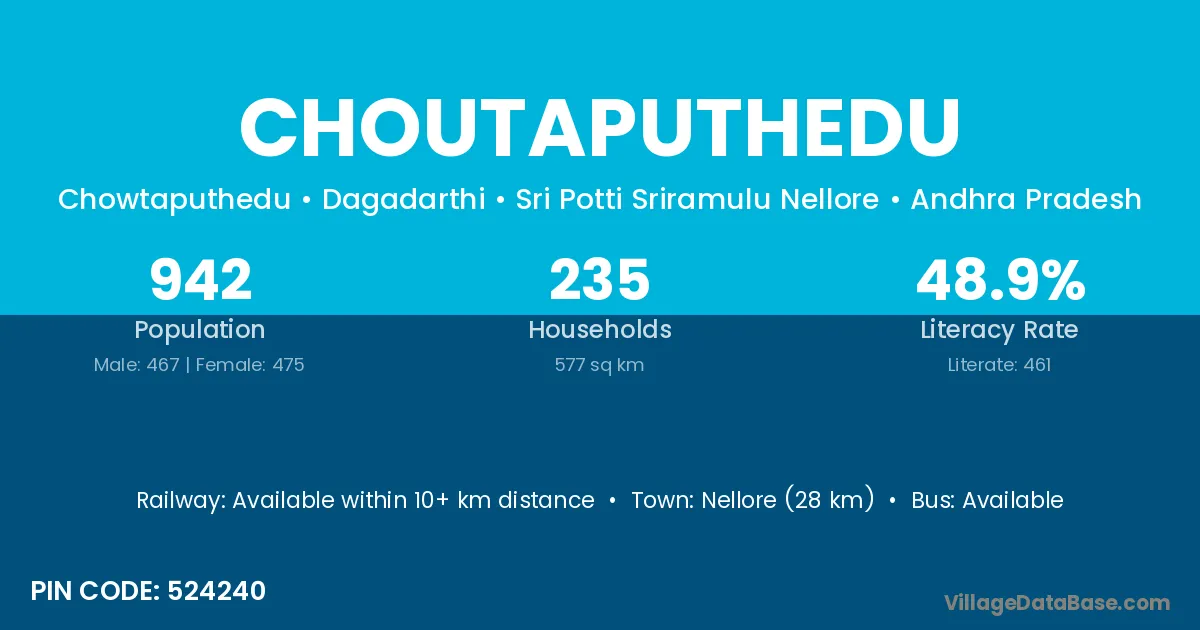 Nellore (28 km) is the nearest town to Choutaputhedu village for major economic activities and is located approximately 28 km away.