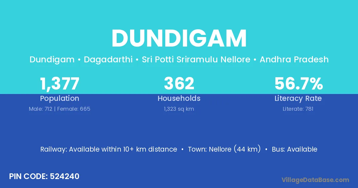 Nellore (44 km) is the nearest town to Dundigam village for major economic activities and is located approximately 44 km away.