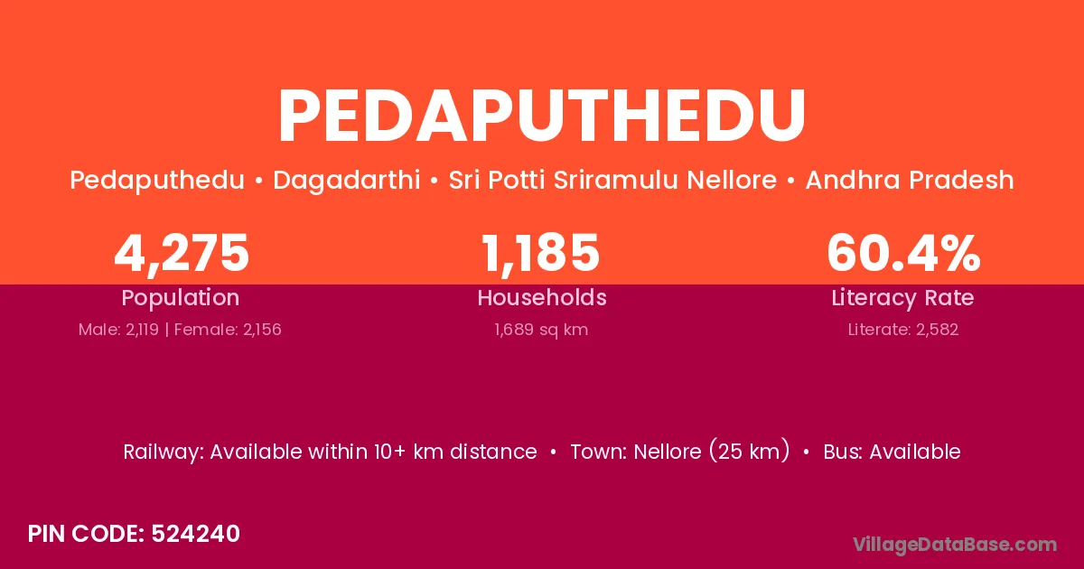 Nellore (25 km) is the nearest town to Pedaputhedu village for major economic activities and is located approximately 25 km away.
