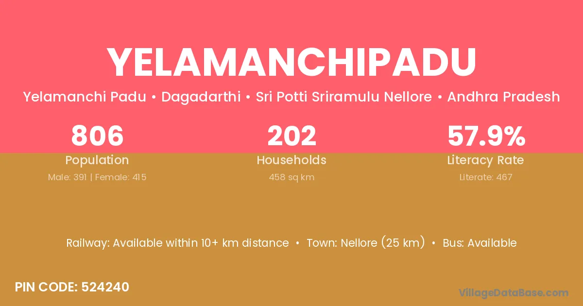 Nellore (25 km) is the nearest town to Yelamanchipadu village for major economic activities and is located approximately 25 km away.