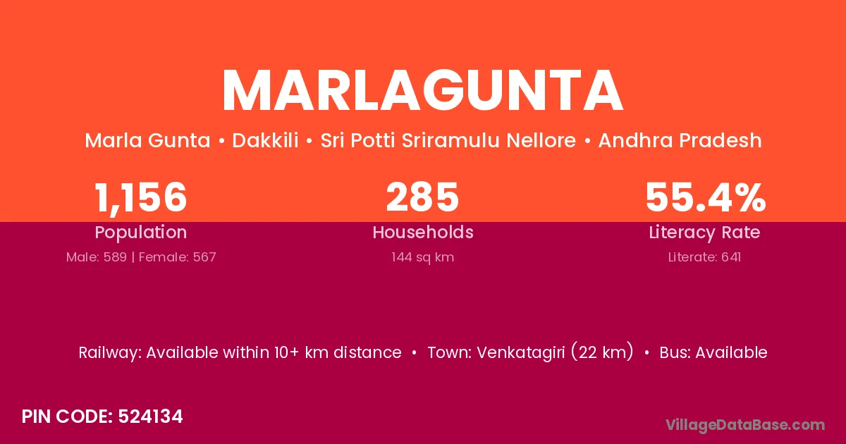 Venkatagiri (22 km) is the nearest town to Marlagunta village for major economic activities and is located approximately 22 km away.
