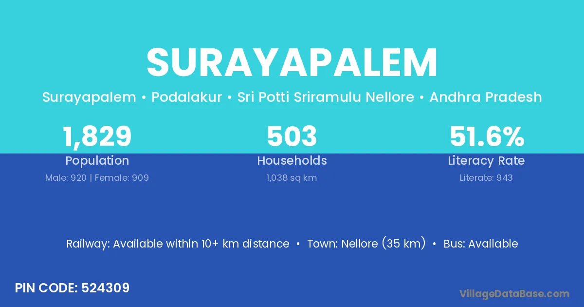 Venkatagiri (14 km) is the nearest town to Surayapalem village for major economic activities and is located approximately 14 km away.