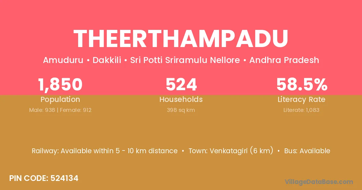 Venkatagiri (6 km) is the nearest town to Theerthampadu village for major economic activities and is located approximately 6 km away.