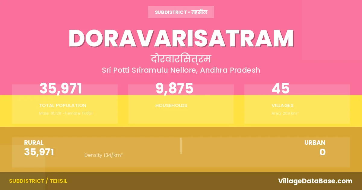 According to the 2011 census The total area of Doravarisatram Mandal is 269 km², with a population of 35971 people. The population density is 134 inhabitants per square kilometre, and there are approximately 9875 houses in the sub district.