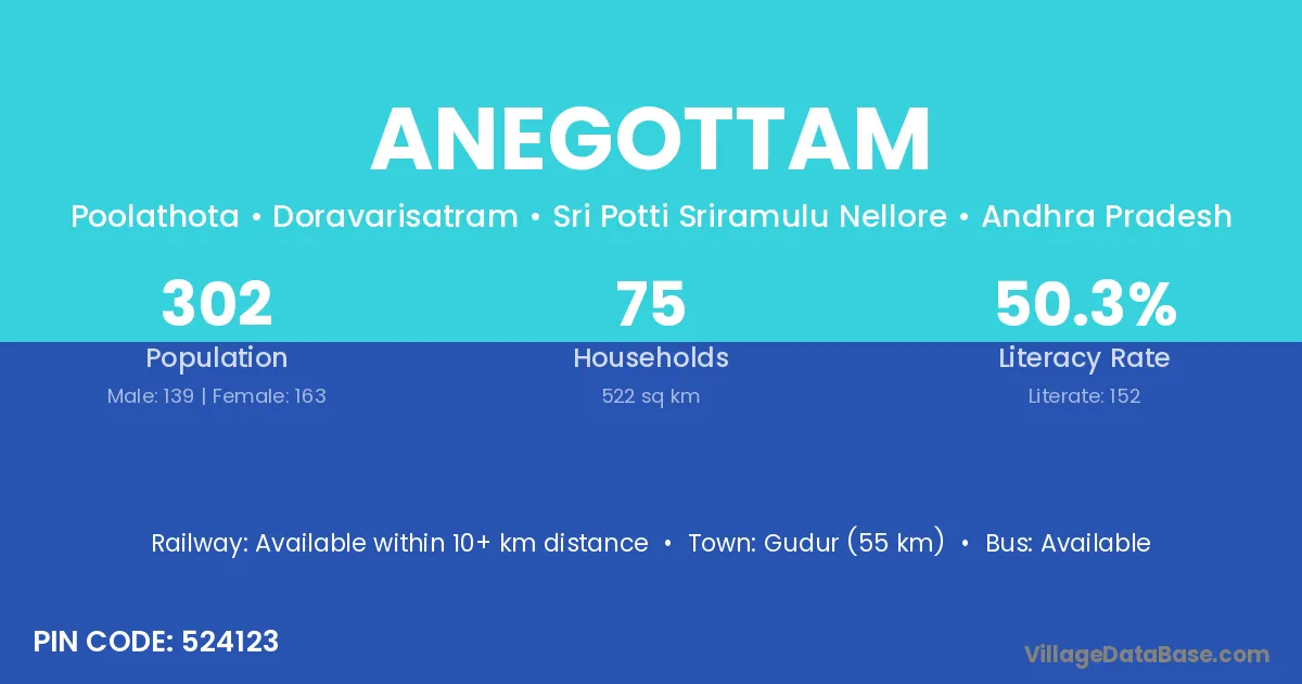 Gudur (55 km) is the nearest town to Anegottam village for major economic activities and is located approximately 55 km away.