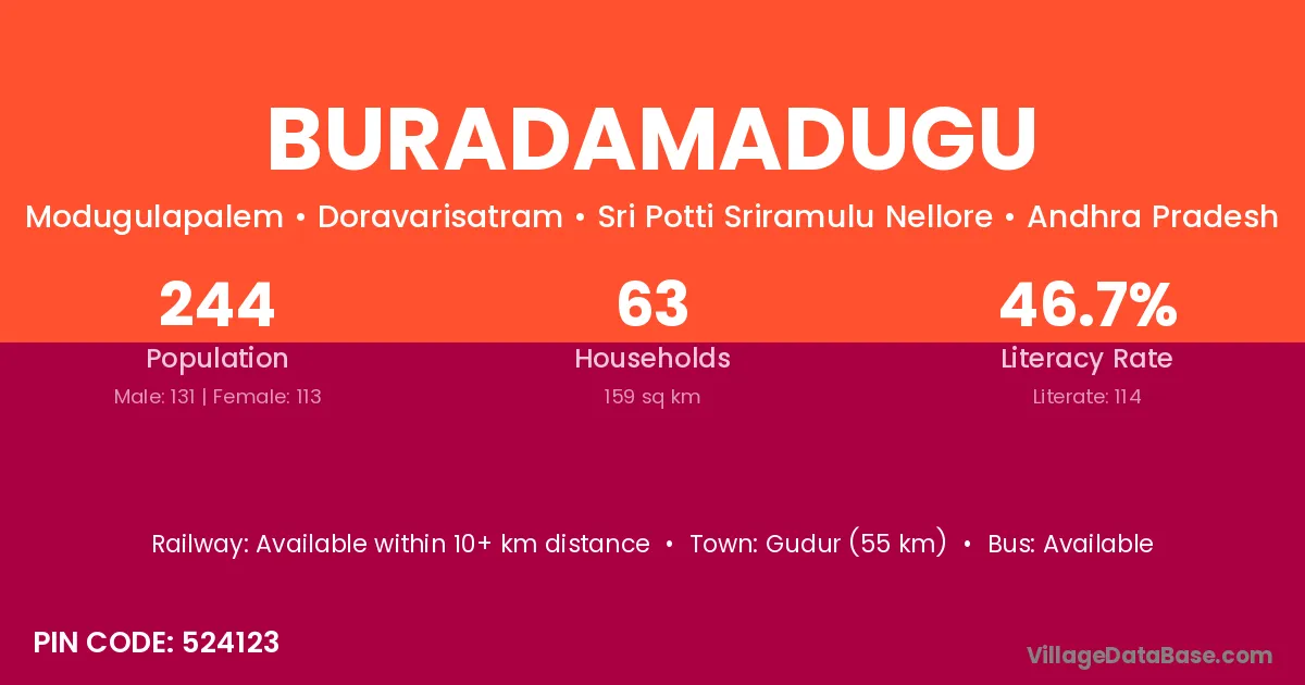 Gudur (55 km) is the nearest town to Buradamadugu village for major economic activities and is located approximately 55 km away.