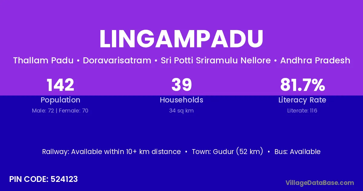 Gudur (52 km) is the nearest town to Lingampadu village for major economic activities and is located approximately 52 km away.