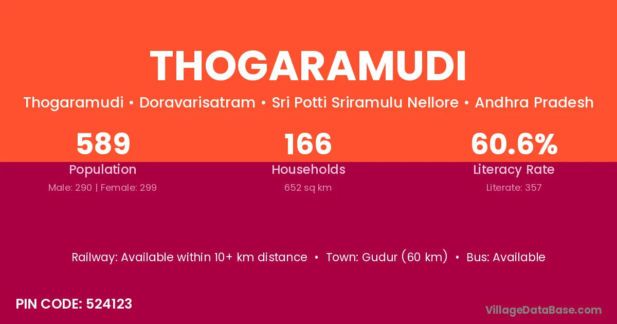 Gudur (60 km) is the nearest town to Thogaramudi village for major economic activities and is located approximately 60 km away.