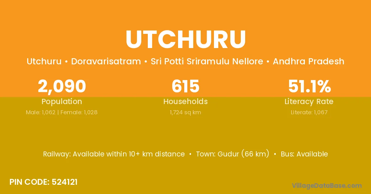 Gudur (66 km) is the nearest town to Utchuru village for major economic activities and is located approximately 66 km away.