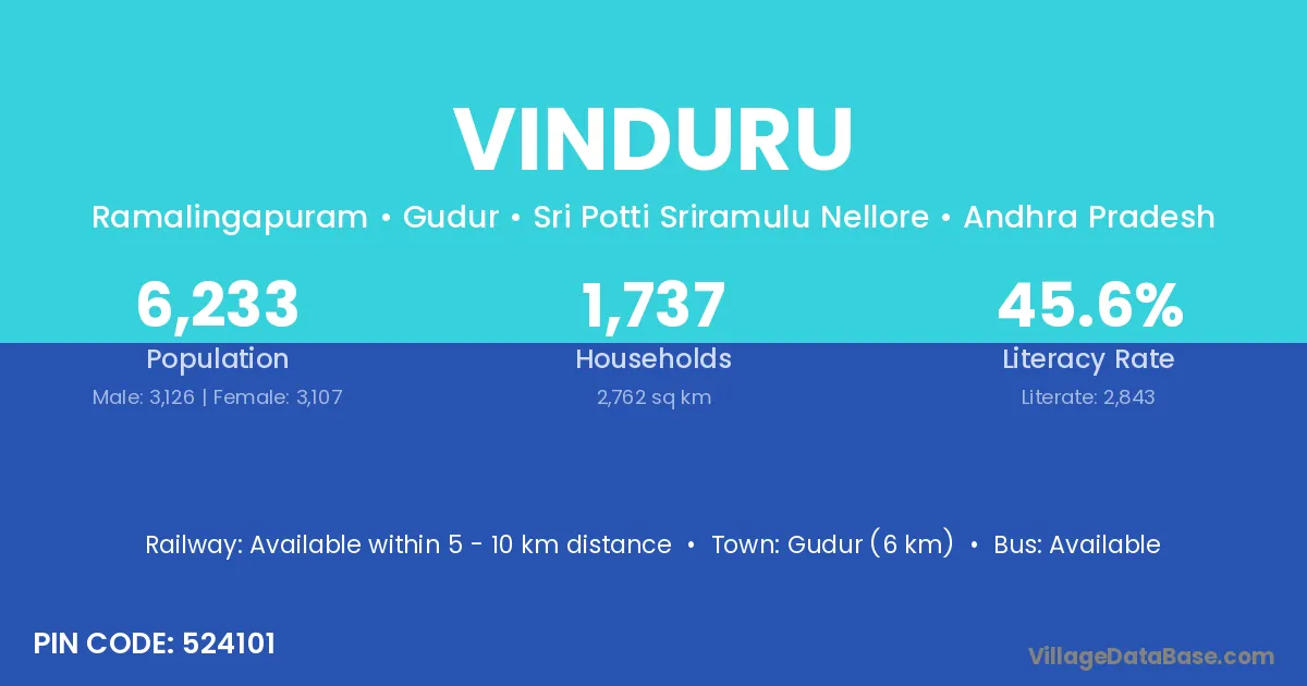 Gudur (6 km) is the nearest town to Vinduru village for major economic activities and is located approximately 6 km away.