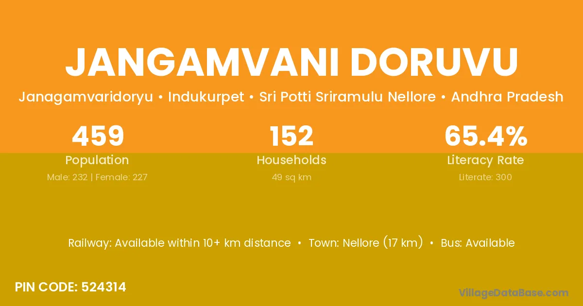 Nellore (17 km) is the nearest town to Jangamvani Doruvu village for major economic activities and is located approximately 17 km away.