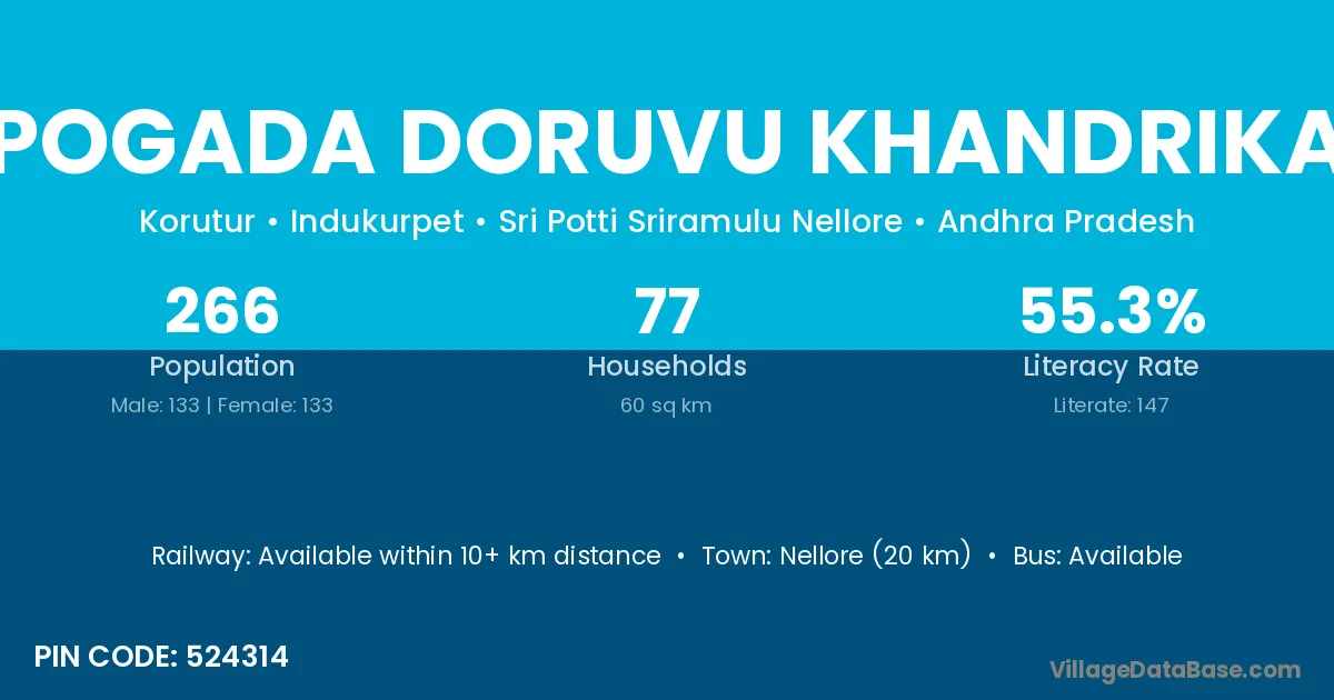 Pogada Doruvu Khandrika village is located in the Indukurpet Mandal of the Sri Potti Sriramulu Nellore district in Andhra Pradesh .