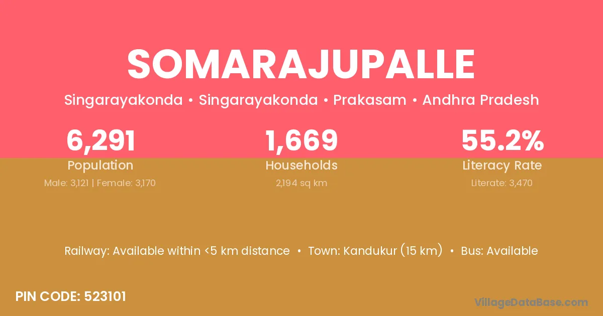 Nellore (20 km) is the nearest town to Somarajupalle village for major economic activities and is located approximately 20 km away.
