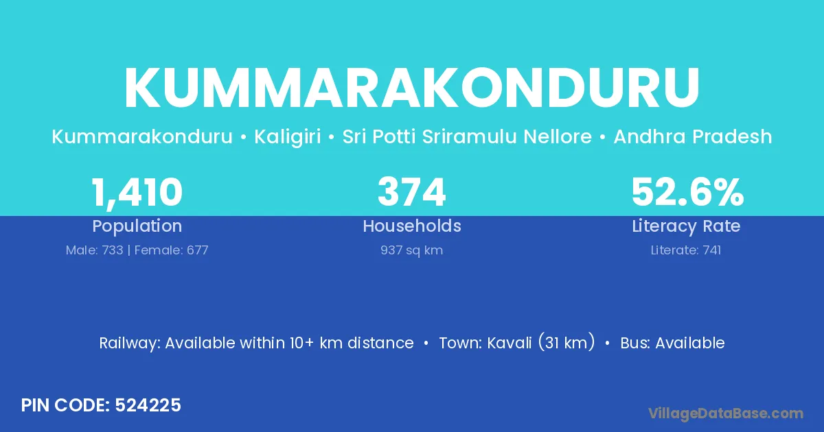 Kavali (31 km) is the nearest town to Kummarakonduru village for major economic activities and is located approximately 31 km away.