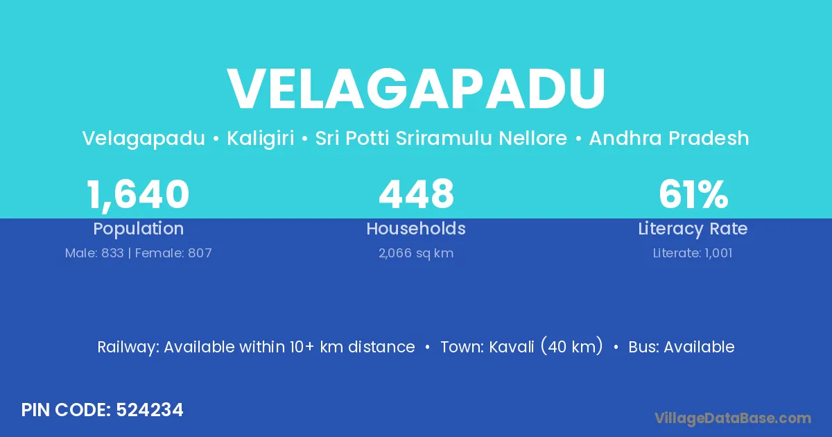 Kavali (40 km) is the nearest town to Velagapadu village for major economic activities and is located approximately 40 km away.
