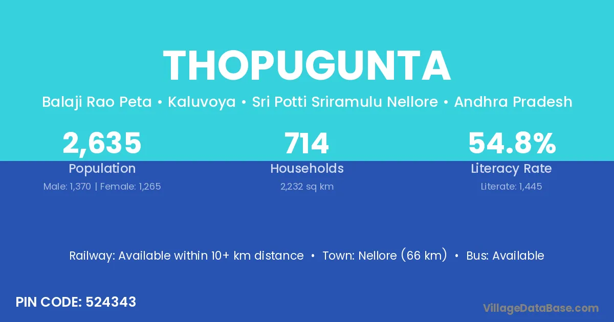 Nellore (66 km) is the nearest town to Thopugunta village for major economic activities and is located approximately 66 km away.